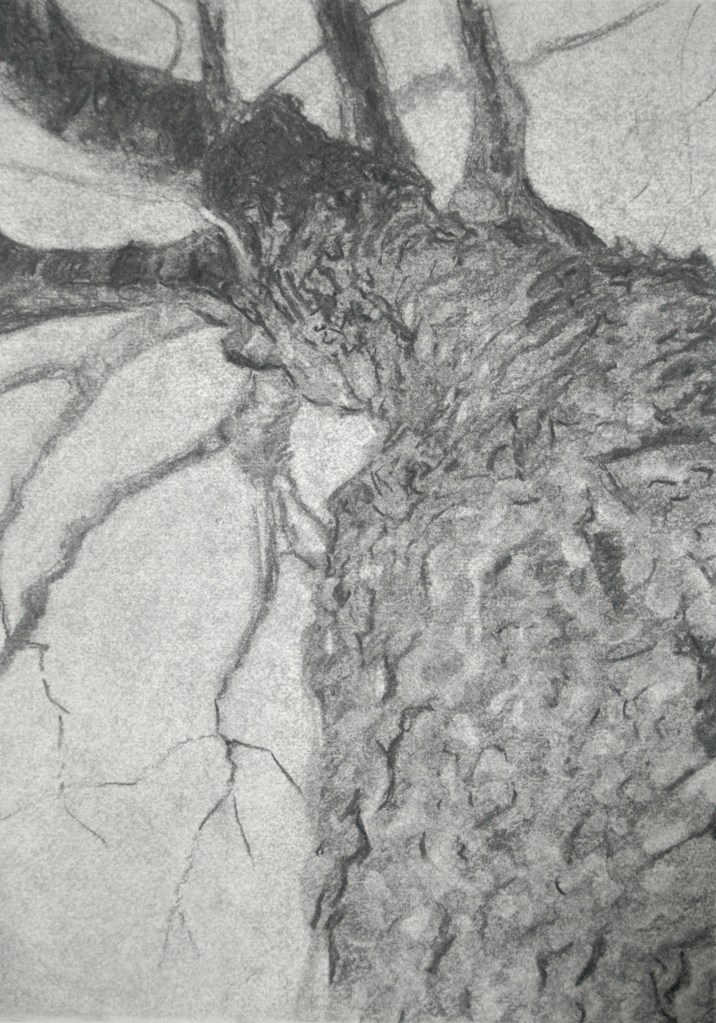 There is something very special about drawing in nature, even in the cold of winter. Staying in the same spot for an extended period of time had an effect on me and the way I was seeing the landscape, the trees and their textured details. Much to my relief I also took photographs to draw from in the warmth of the apartment when Birgit was at home.